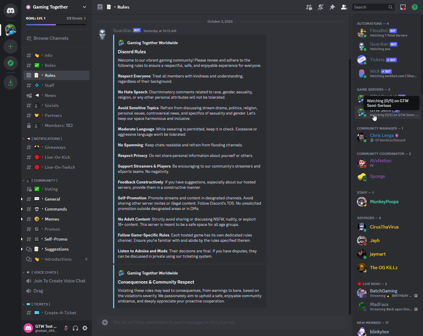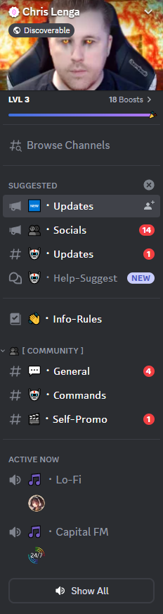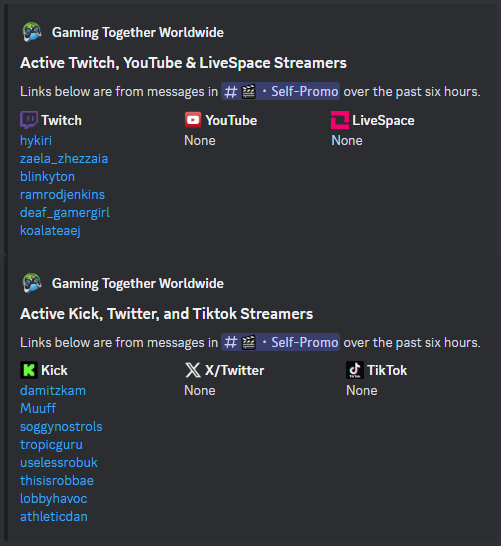 Streamer Bot (v1) - deprecated. This was an ambitious and early concept to enhance streamer discoverability across supported platforms. The bot watched for links in self-promo and updated an embed of recently live streamers, and it had a prototype featured streamer rotation that randomized featured profiles on set intervals.