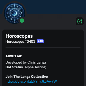 This bot would post horoscopes in pre-defined channels each morning based on admin-configured settings. Originally the project started out as a custom integration for a client, but after multiple requests from others I migrated it to a multi-server bot that at its peak served hundreds of servers and was verified by Discord. The bot pulled horoscope data from a third-party API and formatted it nicely for Discord channels. Due to changes in the API's pricing model and increased costs, I made the decision to retire the bot as maintaining it was no longer financially viable.