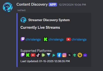 Stream Discovery Bot is a highly ambitious project that continues where Streamer Bot left off. It creates an embed of recently live streamers on supported platforms, and provides a featured profile rotation that surfaces detailed streamer information. The project is designed to connect to a website to improve discoverability, and to be a public bot other servers can run. Planned platforms include Twitch, Kick, YouTube, TikTok, Rumble, Beam, Parti, Instagram, X, Trovo, DLive and Nemo, with Facebook support being phased out.
