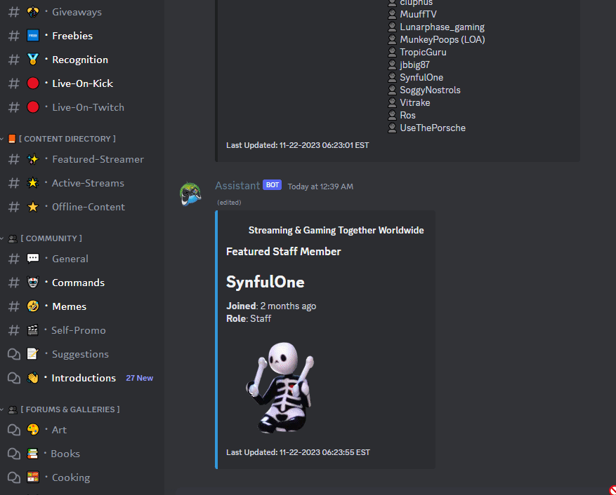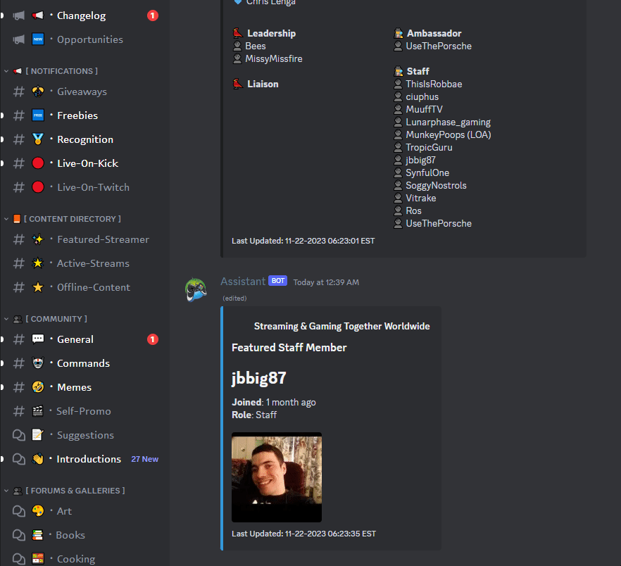 Streamer Bot (v1) - deprecated. This was an ambitious and early concept to enhance streamer discoverability across supported platforms. The bot watched for links in self-promo and updated an embed of recently live streamers, and it had a prototype featured streamer rotation that randomized featured profiles on set intervals.